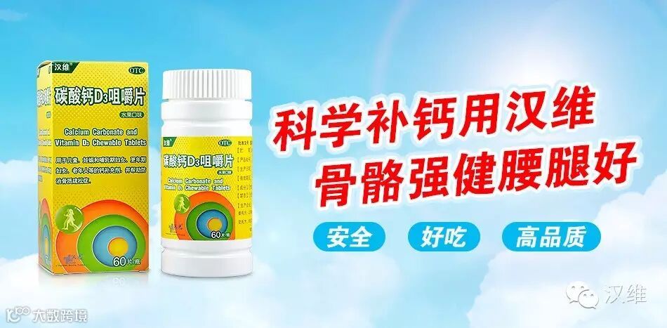 不同的钙盐吸收率也是不同的。碳酸钙(39%)>乳酸钙(32%)>葡萄糖酸钙(27%)。然而仅仅依赖钙盐的吸收率是不足够的,科学证明,血液内维生素D需维持一定浓度才能保证最佳的钙吸收。汉维(碳酸钙D3咀嚼片)采用了碳酸钙的钙盐,其中更含有200国际单位的维生素D,进一步提高了钙的吸收率和利用率。