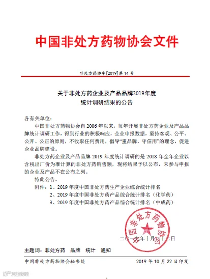 2019年10月22日,中国非处方药物协会颁布了《关于非处方药企业及产品品牌2019年度统计调研结果的公告》文件,公布了本次调研的结果。