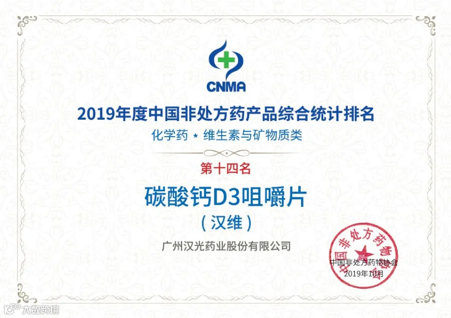 而在2019年度中国非处方药品综合统计排名(化学药)的维生素与矿物质类药物排名中,汉维®碳酸钙D3咀嚼片从去年的第15名上升至第14名。