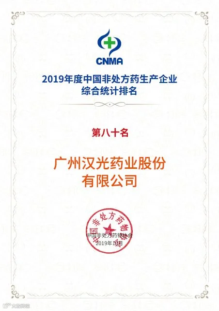 在2019年度中国非处方药生产企业综合统计排名名单中,广州汉光药业股份有限公司排名从去年的第95名上升至第80名。