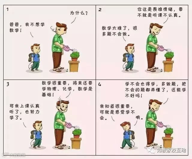 可以看得出,小明的爸爸在积极地“引导”小明,他认为小明对数学的重要性认识不足,不仅用“畏难情绪”“听课不认真”直接贴标签、下结论,还给出了“多做练习”这样的“解决方案”。可是,孩子并不是不知道数学的重要性,“多做题”、“改错题”,道理都明白,可为什么还是不想数学?
