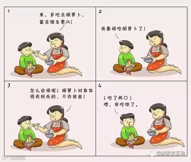 还有的家长和孩子聊天时,总是急于下结论,或急于用自己的观点否定孩子的观点,比如对话2中的妈妈,就是急于纠正孩子“讨厌胡萝卜”的看法,结果孩子并没有因此就顺从地多吃一些胡萝卜,反而直接结束了对话。