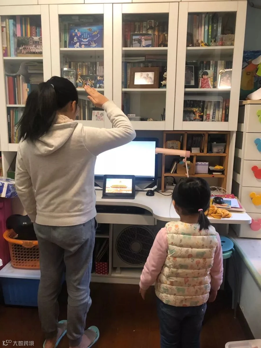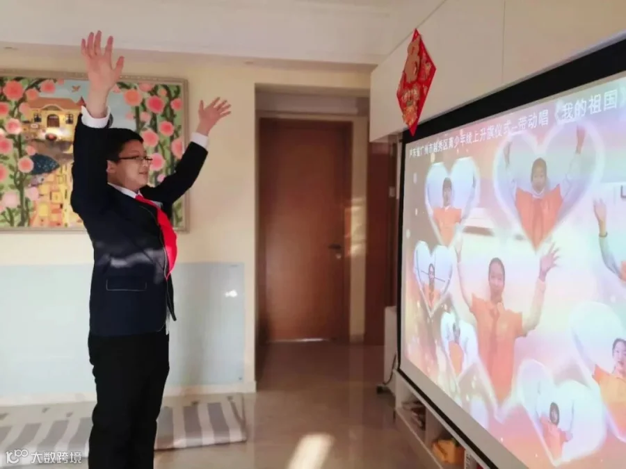 所幸过了没多久,网络就恢复了正常。在天河区华阳小学,孩子们的“云升旗”以观看视频的形式进行。学校大队部提前录好了升旗仪式的视频,全体学生在8:30准时开视频参加升旗仪式。许多家长自发给孩子拍照,发到班级群里分享,留下难忘的记忆。