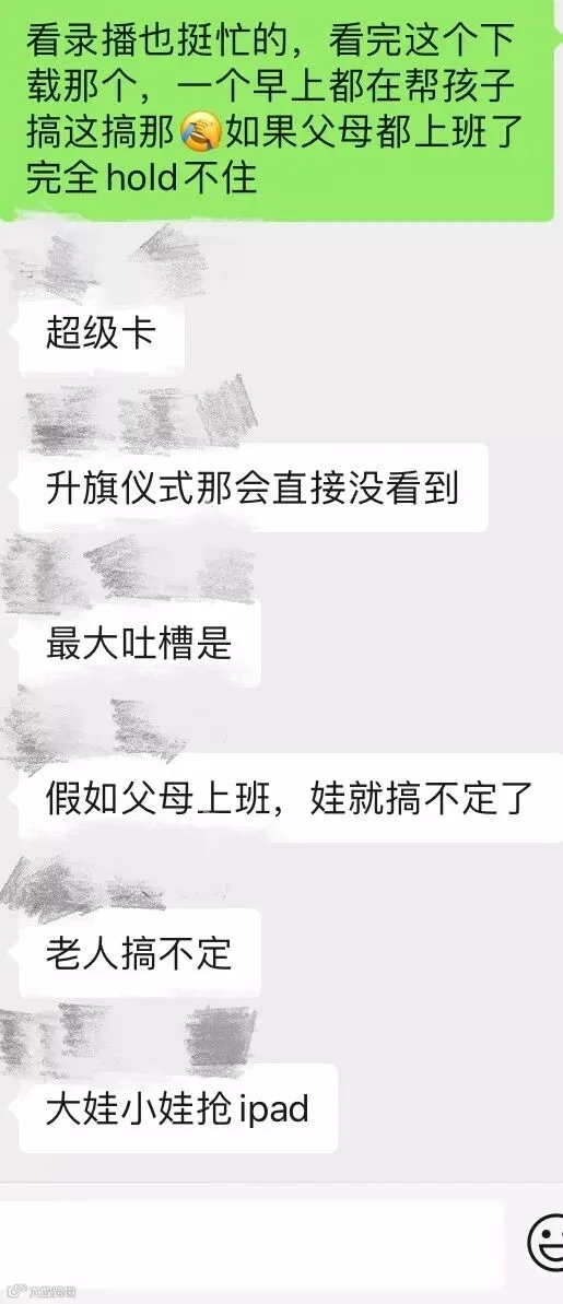还有一些学校,班主任老师组织了视频云班会,一开摄像头,全班孩子看到了彼此,全体激动得尖叫,吓得老师又把视频关掉了。