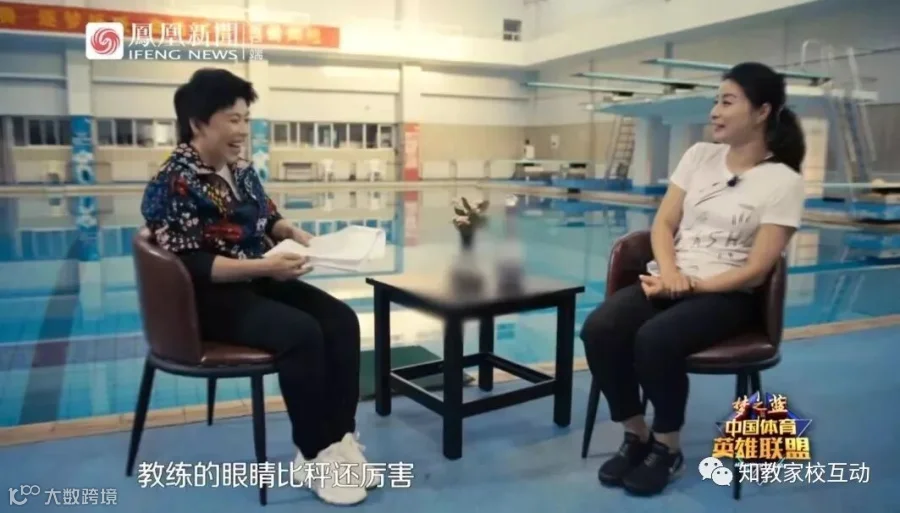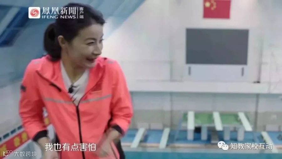 访谈中,晶晶带邓亚萍走上跳水台,她向泳池探了探身子又缩了回来,说好久没训练,已经不太敢往下看了。