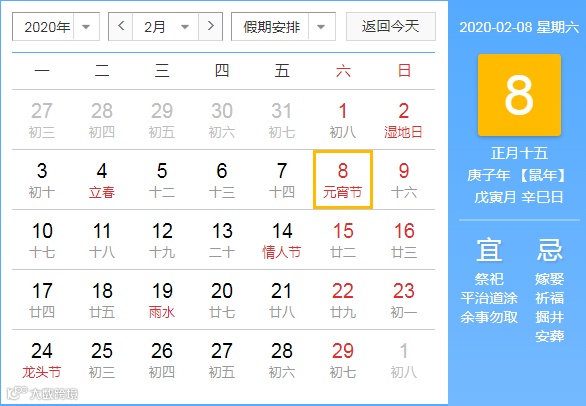 2020年元宵节是2月8日