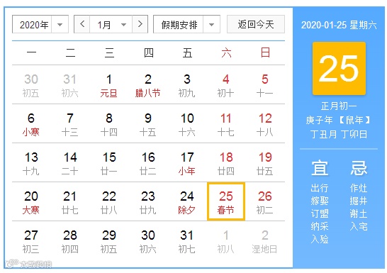 2020年春节是在1月25日