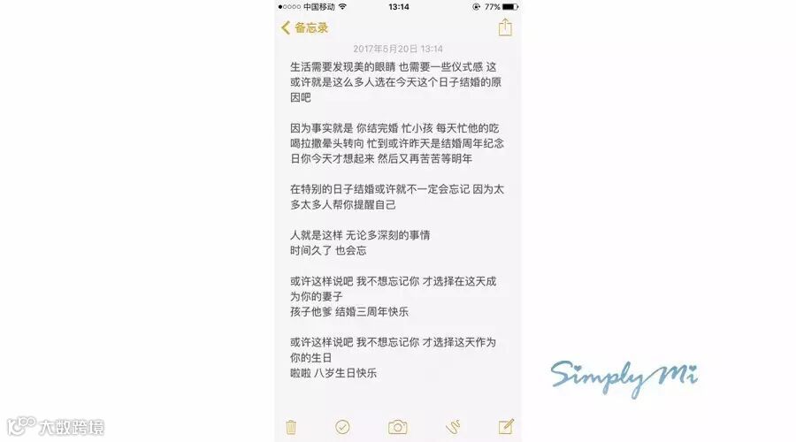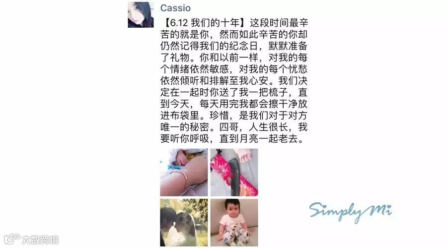 至今他们还是坚持再忙也要偷闲过两人时间,去看电影,去旅行,甚至有时只是两个人一起去买一束花。结婚三周年,Miga给冰茶的留言让我感动不已。