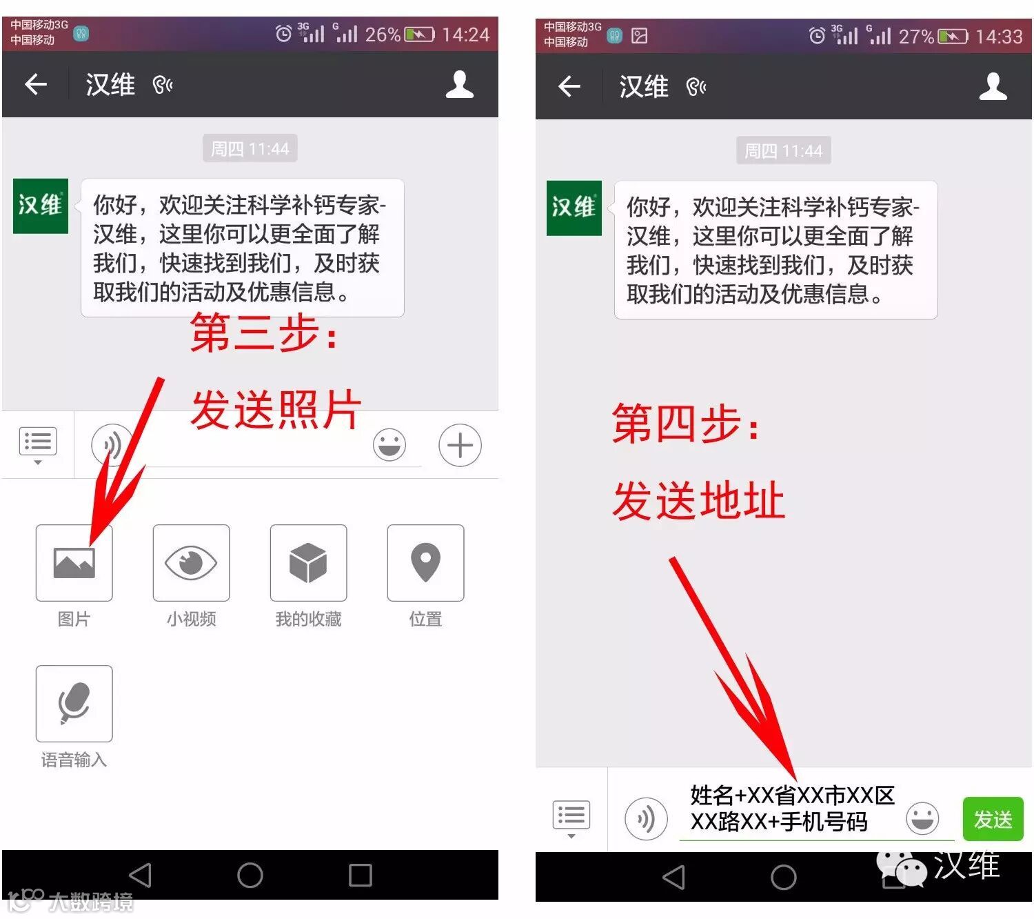 上传:把照片发送至我们的“汉维”微信公众号,并写上你的详细地址。(编辑格式:省份、城市+具体门店名称+姓名+电话+收货地址)