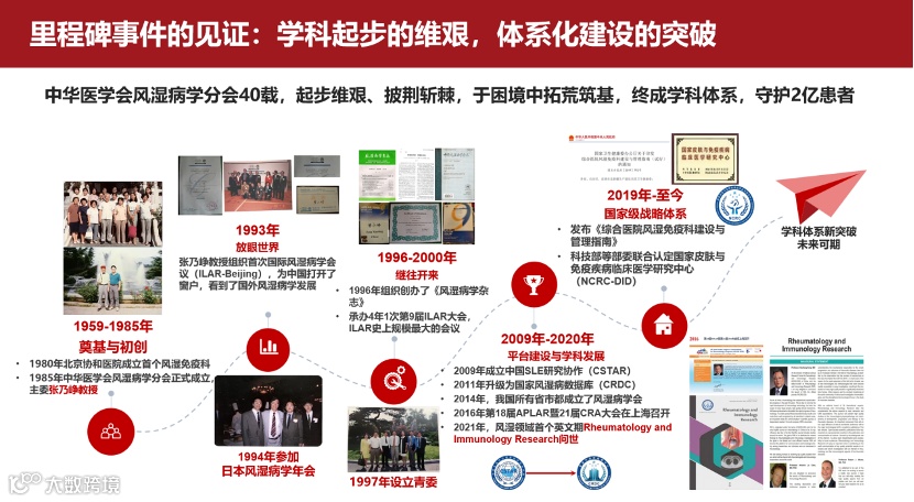 北京协和医院曾小峰教授以《学科的崛起与药物的远征》为主题,拉开了开幕式的第一个专题序幕。曾教授系统回顾了我国风湿免疫学科四十年来的发展历程,他指出,风湿免疫学科在20世纪80年代尚处于起步阶段,1985年中华医学会风湿病学分会的成立,标志着学科建设迈出关键一步。在张乃峥教授等前辈的引领下,学科体系逐步构建,为患者提供了更规范的诊疗服务,并不断加速了风湿免疫学科的发展步伐。