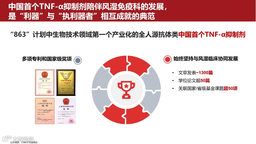 曾教授重点强调了生物制剂对风湿学科发展的深远影响。二十年前,中国首个TNF-α抑制剂——重组人Ⅱ型肿瘤坏死因子受体-抗体融合蛋白的成功上市,成为学科发展的“破局者”,其通过1300余篇学术论文、50余项基金课题的科研积累,形成具有中国特色的临床证据体系,多项原创成果荣获国家技术发明奖、中国专利金奖等荣誉。从而开启了生物制剂在风湿免疫科的蓬勃发展期,这不仅是"有药可用”的突破,更推动了诊疗理念的根本性革新。正是基于生物制剂的发展现状,报告重点指出,我国逐步确立以“达标治疗”为核心的现代风湿病管理策略,不断提升患者治疗需求与生活质量。