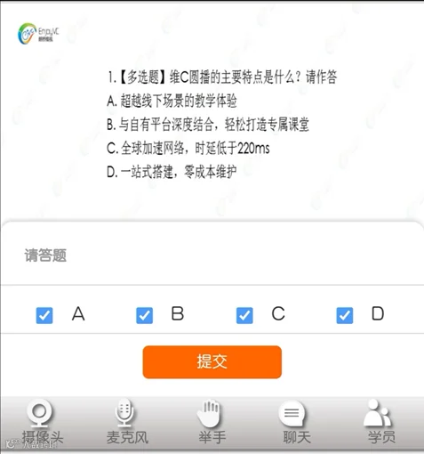 老师端点击“开始答题”后,学生端的界面就会出现“ABCD”选项,学生输入答案,点击提交即可。