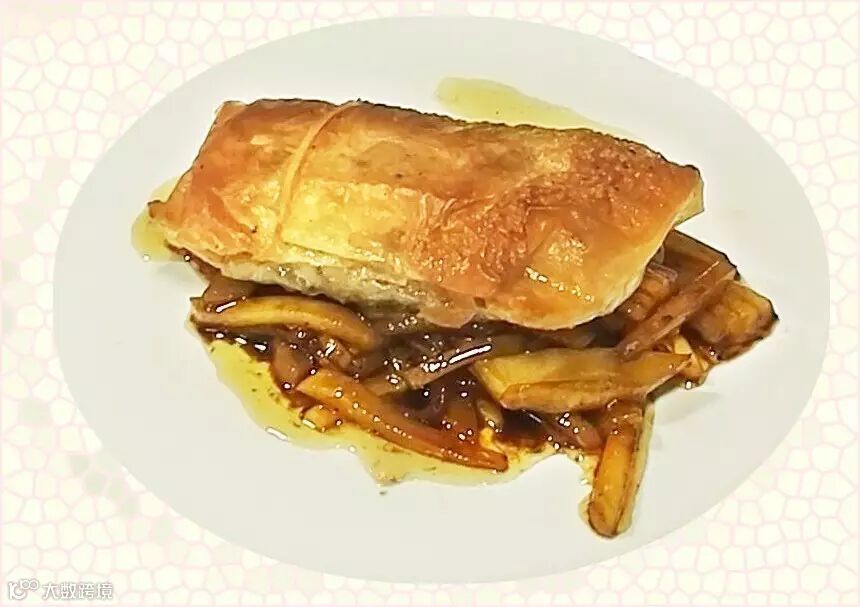 Step 5:将酥皮包裹好的鱼肉放入刚刚的煎锅中再煎30s左右,将酥皮煎至有些金黄色,然后盛起放入焗炉中,用200°C高温焗10分钟。