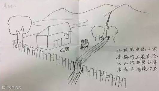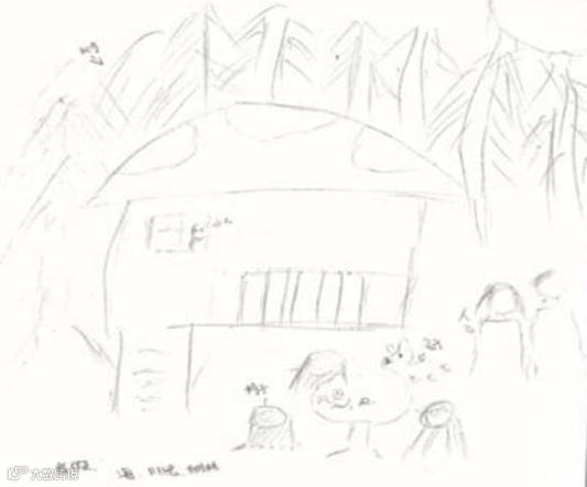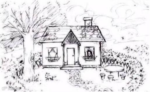 小树密集且众多,常获得身边人支持,但这种支持缺少持续性和深刻性,所以不像上一副图,画出一棵足够饱满的大树;树木均围绕房屋,给房屋保护作用,显示出内心渴望足够的安全感;树枝下垂,树的线条凌乱,表达内心相对消极,为人小心谨慎。