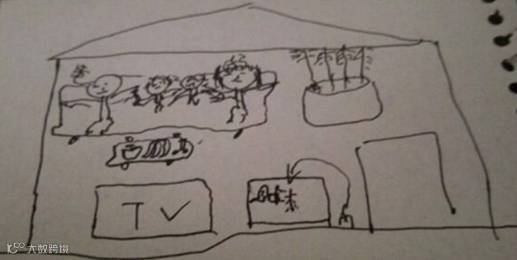 这是描绘房子内部,一家四口互动的透视图,杨花儿指出画透视图的人,心智水平不高,推断此图为小朋友所画。