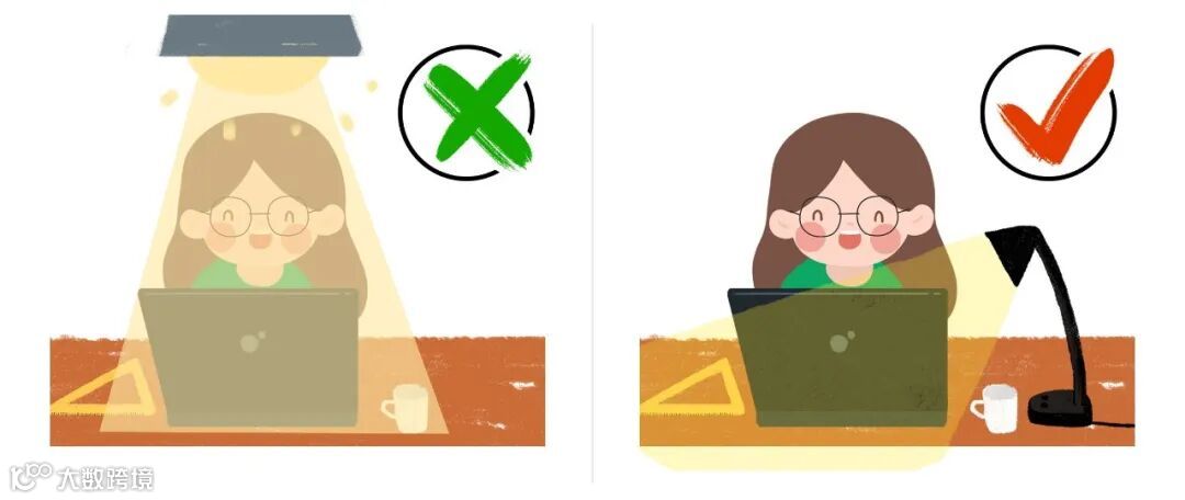 晚上:尽量不要让灯位于您的头顶或背后,如果必须是的话,您可以关上头顶或背后的灯,并在您电脑的后方或侧前方,开一盏台灯。