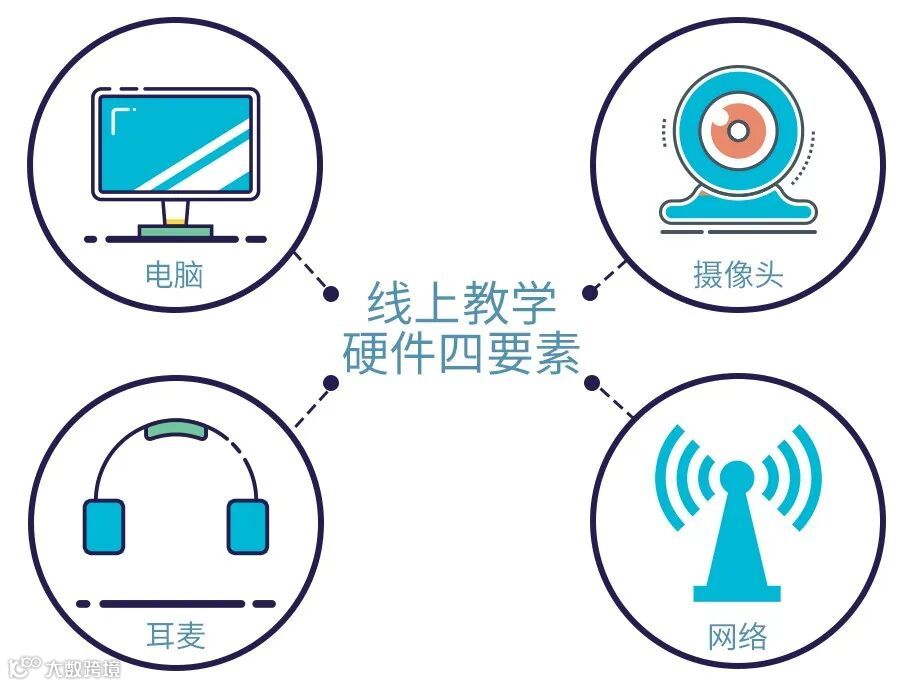 线上教学硬件四要素:电脑、摄像头、耳麦、网络。