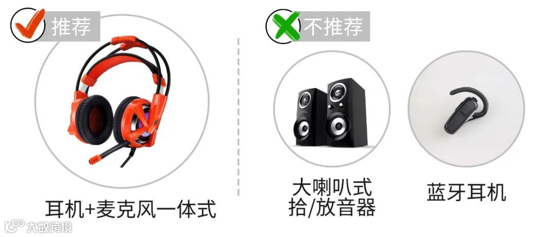 * 耳麦:个人使用推荐使用耳机+麦克风一体式设备就行,比如我们最常见的手机的耳机就是自带收音效果,尤其在空旷的空间,不建议使用大喇叭式的拾、放音器,也不建议使用蓝牙耳机哦;