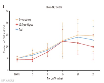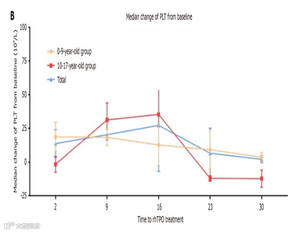 ● 血小板计数相对于基线的中位数变化:治疗第23天儿童组血小板计数达峰值,为137(58,214)×10⁹/L,青少年组于第16天达峰值,为111(46,199)×10⁹/L。两组血小板计数均在治疗2天后开始升高,儿童组呈缓慢升高趋势,青少年组则在治疗16天后开始下降(图1)。