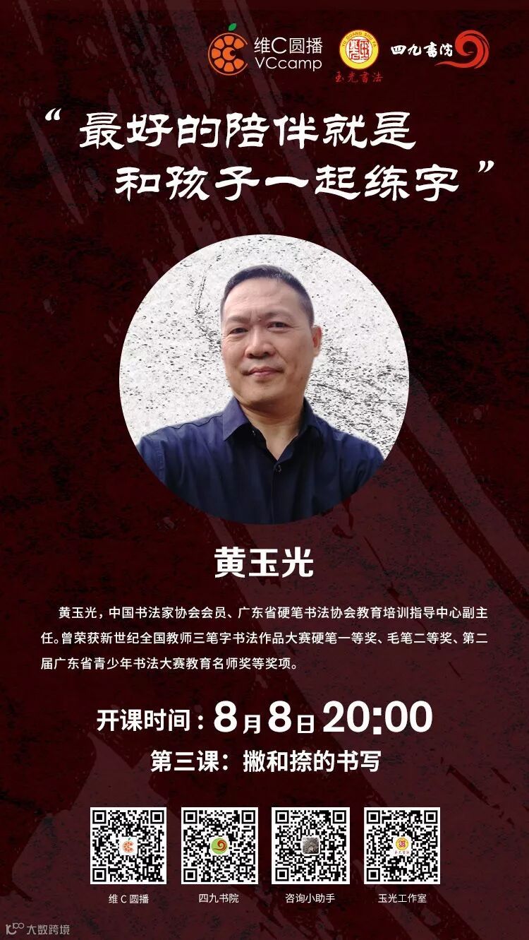 2019年8月6日晚八点,由黄玉光老师、四九书院及维C圆播平台的共同开设的黄玉光老师公益线上书法课程第二课开播!