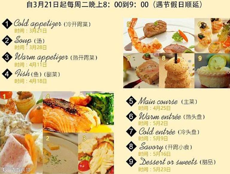 一连9周,贯穿法餐点菜顺序中主要的9道菜