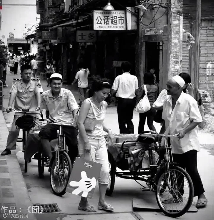 这是一张生活日常照,照片中夹杂着几个阶层。女主人、打工者还有城管,反映出一种长期的生活状态。