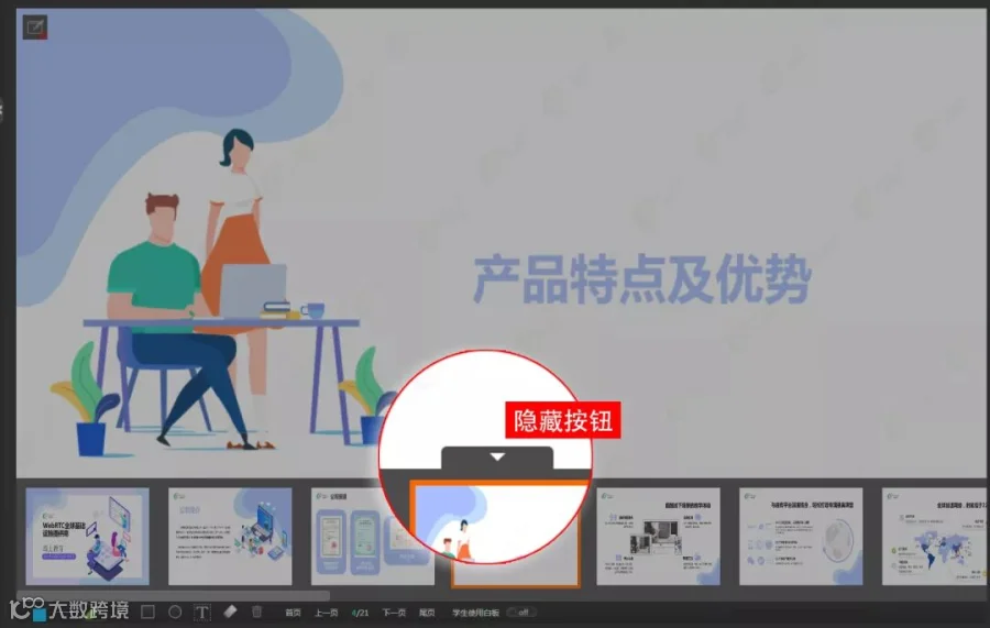 返回主屏幕后,很多用户可能会发现多了一个“隐藏按钮”。没错,这个也是维C圆播的一个新功能。点击“隐藏按钮”可以展示文档的缩列图,拉下面的进度条,选取您所需要的页数。那么多页的文档,再也不用一页一页地翻了。不需要缩列图的时候,再点击“隐藏按钮”,隐藏起来就可以了。