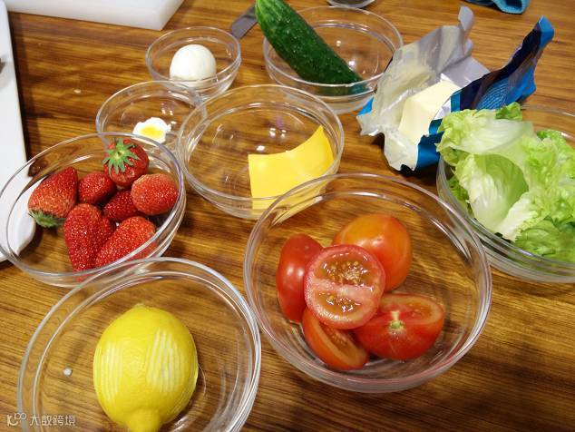4. 青瓜﹑西红柿﹑草莓﹑鸡蛋﹑片装芝士﹑火腿片等配菜