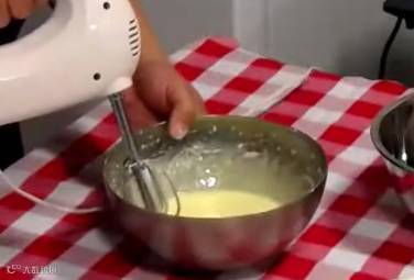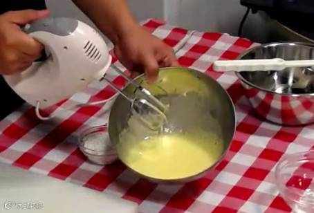 接着用电动搅拌器把鸡蛋打发到发白程度