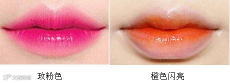 然后在同样的位置,再涂抹橙色系闪亮唇轴