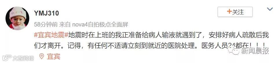地震时在上班的我正准备给病人输液就遇到了,安排好病人疏散后我们才离开。记得,有任何不适请立刻到就近的医院处理。医务人员24小时都在。