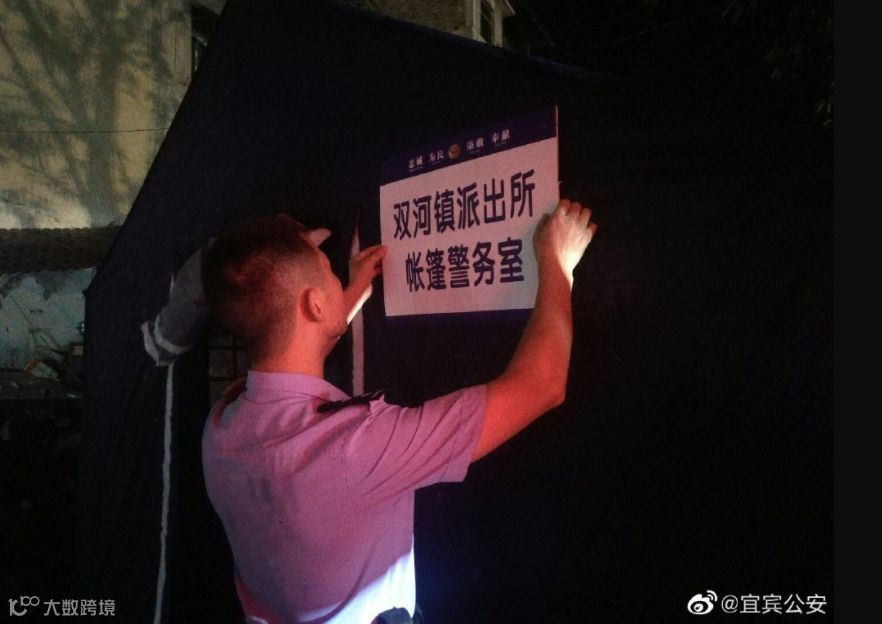 6月18日晚,长宁县公安局双河派出所民警来到双河中学和笔架广场灾民安置点,设立起了帐篷警务室,为这个大雨倾盆的夜晚添上了一份心安。