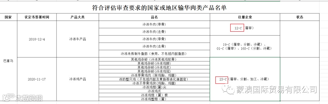 新增1家牛肉加工厂,厂号为12-C;新增1家禽肉加工厂,厂号为23-C。