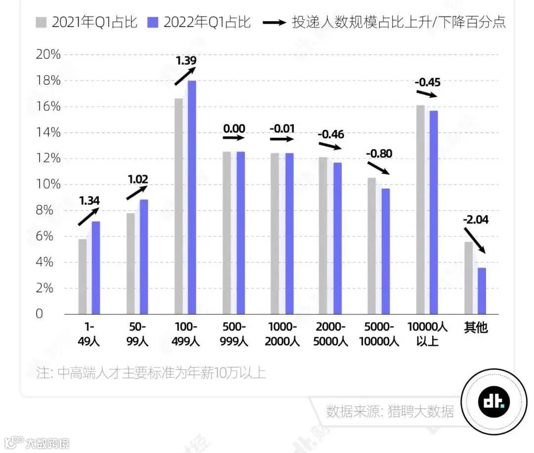 猎聘数据表明,与2021年第1季度相比,2022年第1季度,中高端人才投递大公司(1000人以上)的比例降低,人数在5000-10000人的企业,人才投递占比降低较多,减少约0.8个百分点。