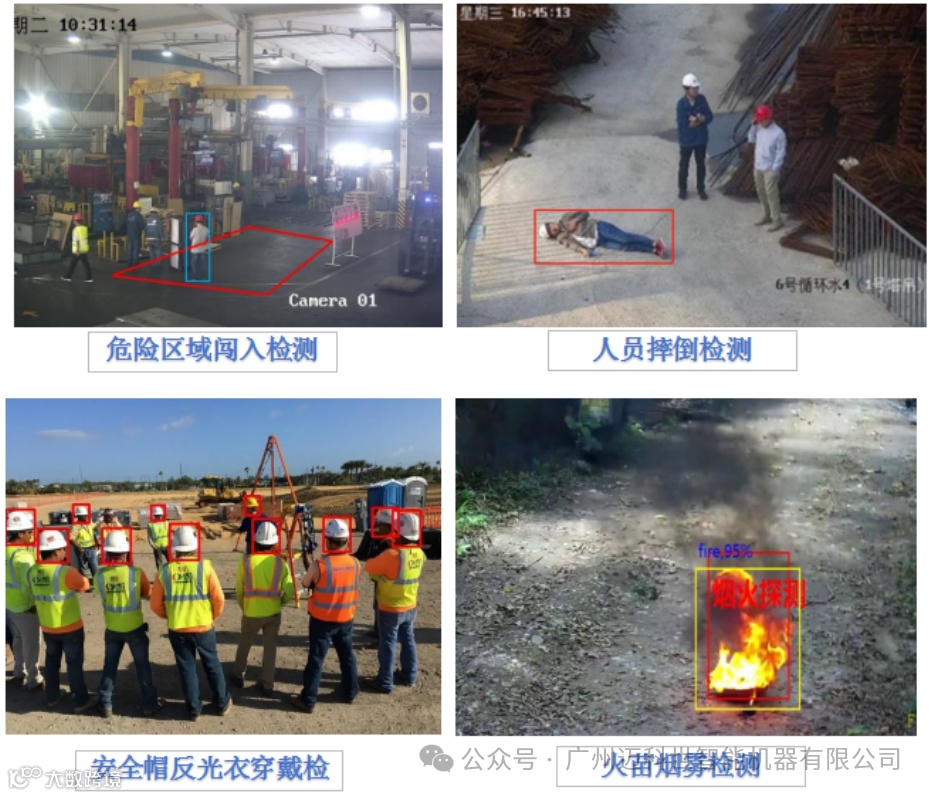 安全帽反光衣穿戴检测、危险区域闯入检测、火焰烟雾检测、人员摔倒检测等、、