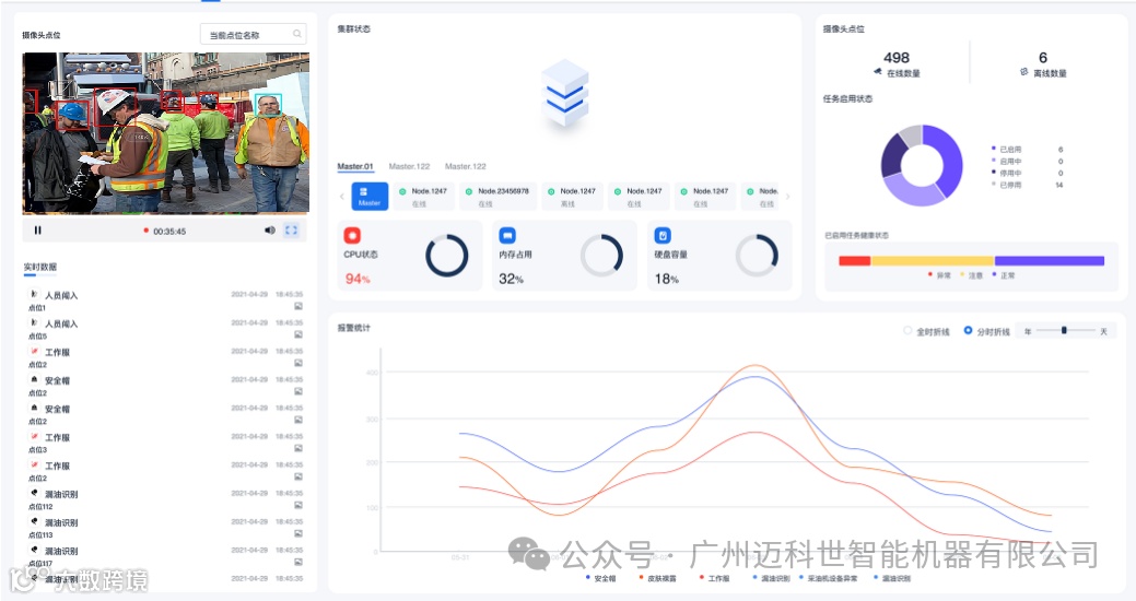 该视觉AI运算主机对视频数据进行分析,自动实时监测现场人员未带安全帽反光衣穿戴检测、危险区域闯入检测、火焰烟雾检测、人员摔倒检测等等不安全行为,发现异常情况时系统立即发出警报提醒,安全管理人员及时到现场督促处理,形成安全管理闭环。