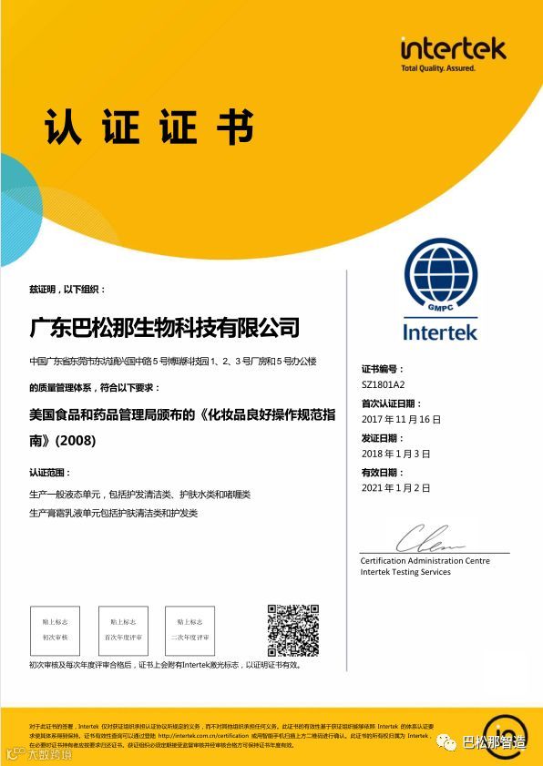 日前,广东巴松那生物科技有限公司顺利通过国际第三方测试和认证公司Intertek的严格检测和审核,获得美国FDA的GMPc认证及欧盟ISO22716质量体系认证。一次性通过两项国际权威认证,这意味着巴松那工厂确保所有的产品在安全无污染的环境下生产,保证了产品的高品质高质量!世界工厂,卓越品质!巴松那始终秉承着“品质如我生命,信誉至高无上”的理念和“科学创新,匠心仁爱”的精神 ,将以专业品质铸美业新篇,为您的美丽健康保驾护航!