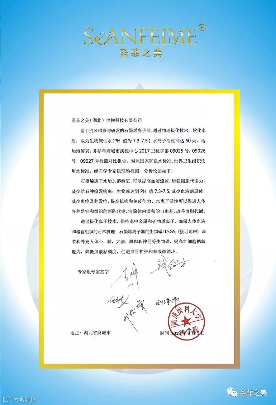 由香港圣菲之美国际健康产业集团研发中心参与研发并改良应用于居家生活和健康产业的石墨烯离子器,经中国同济医科大学医学和药学专家组鉴定,其处理过的水对于改善亚健康和预防医学方面有非常独到的效果。