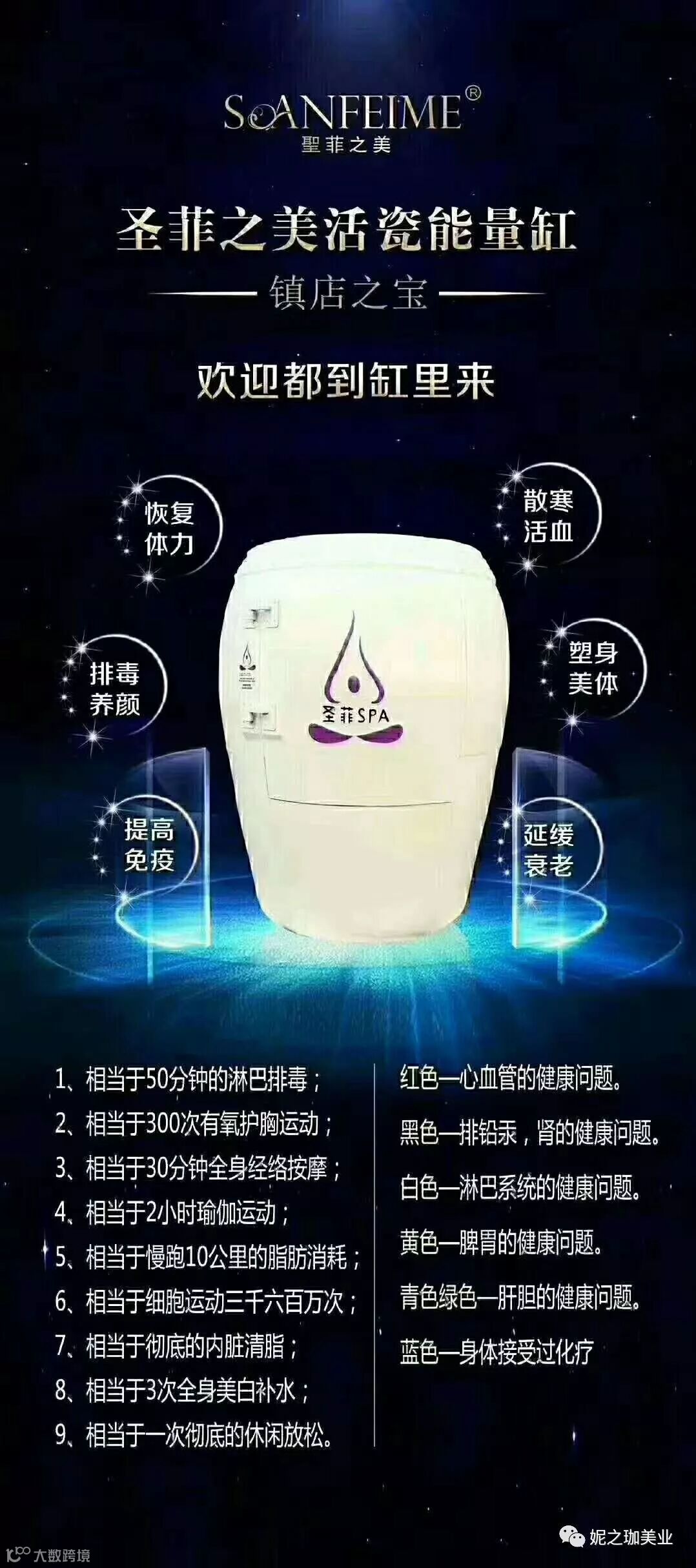 人在缸中,受到冷热循环熏蒸及相关能量的作用,体内温度也随之上升到42℃-47℃之间,此际,大小汗腺被充分打开,体内深层汗液将从敞开的汗腺排出,因此由排出的汗液“颜色”可知身体健康状况。