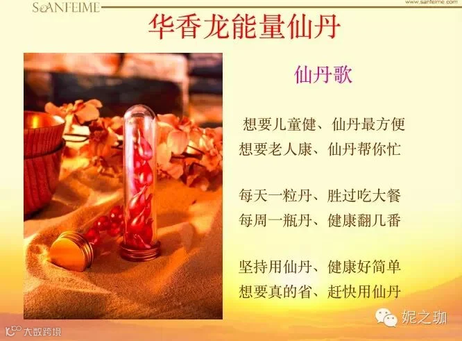 4.能量与促进循环速度不同:真正的仙丹按摩在皮肤上,可以感受到身体温暖得很快,微循环加快,透过5D仪器检测,用前和用后,细胞的能量变化非常大,仅使用一次,就能看到从不可修复变得可以修复,从缺乏能量状态变成充满能量的健康细胞。连美容师用按摩,也会感觉到冰凉的手掌暖得特别快。假的仙丹经过很长时间的大力搓才能有一点点暖意,变化不明显。