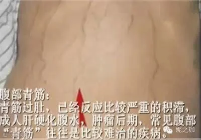 2.腹部青筋,俗话说;“青筋过肚”。这已经是比较严重的积滞;成人肝硬化腹水,肿瘤后期。腹部青筋往往是比较难治的疾病。