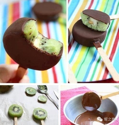 10 将猕猴桃切成片,然后裹上巧克力酱,入冰柜冷冻,尽情享受美味吧。
