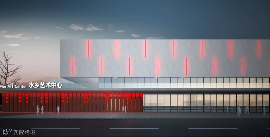 项目建筑外立面以一个大围合的长方几何体为造型,结合灯带和局部切角的细部处理,抽象化地展示了洪梅花灯的意象。