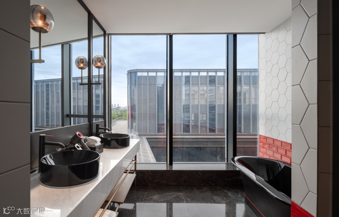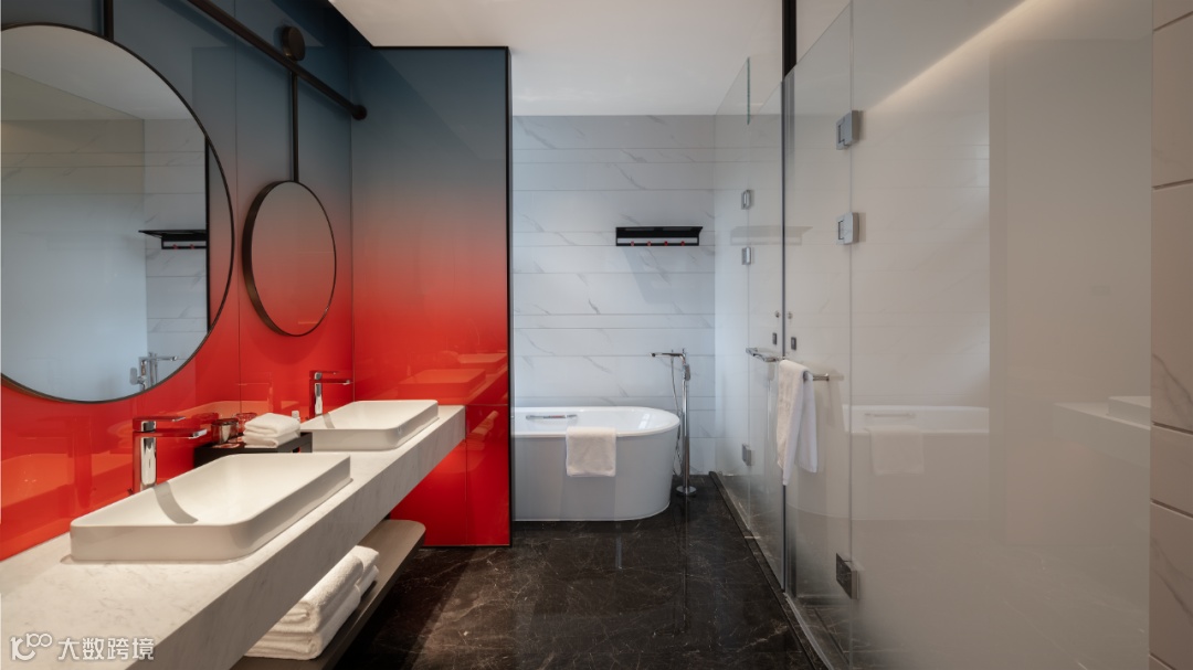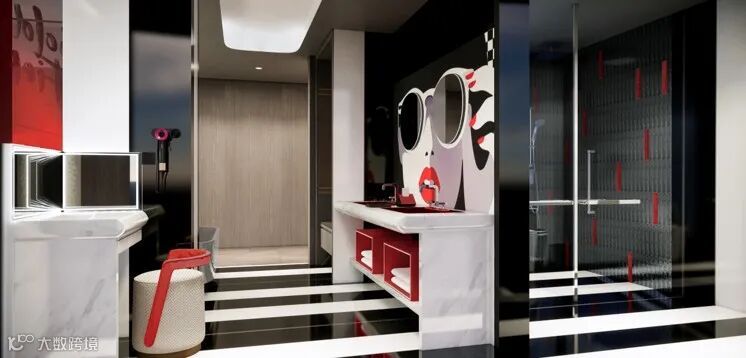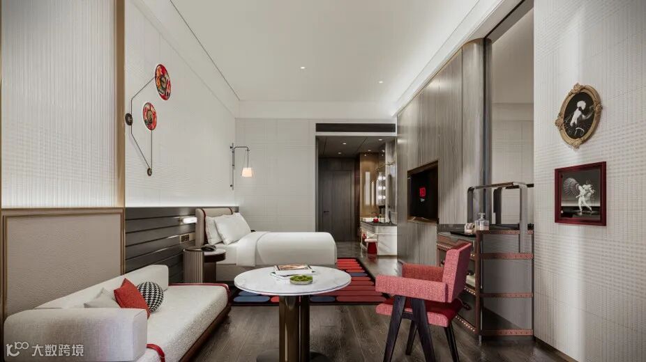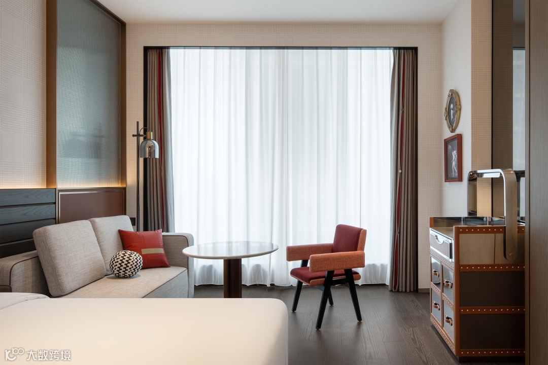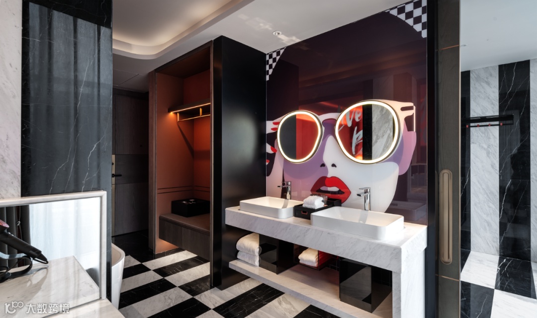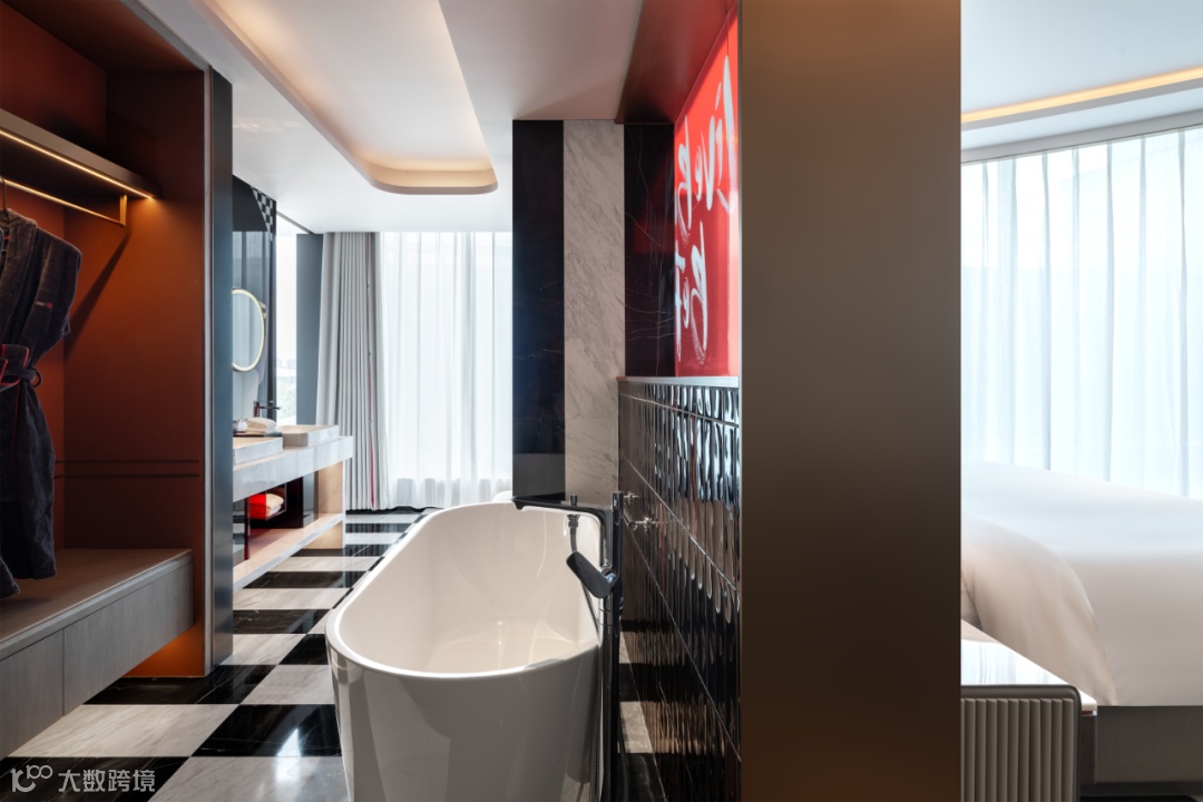 Studio套房设计主题为古代剑术与现代击剑的碰撞,通过材质对比与几何线条展现锐利与优雅。半开放的空间设计与时尚有趣的卫生间相融合的朦胧感,显出丽芮的时尚与有趣的调性。