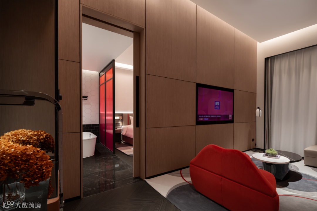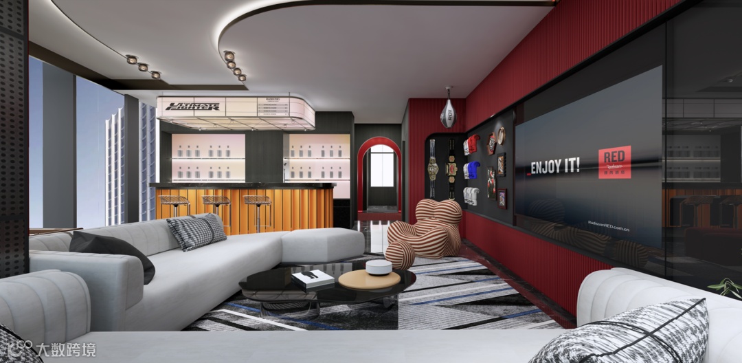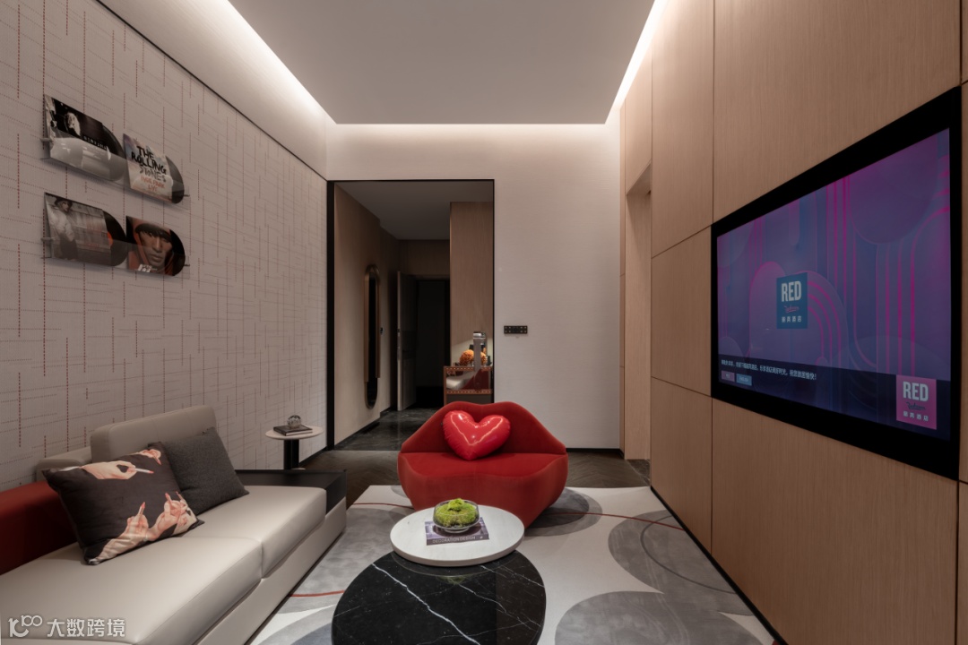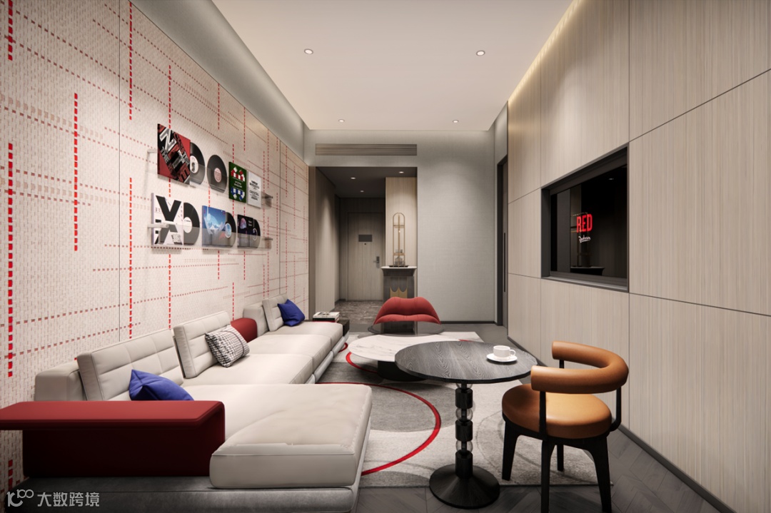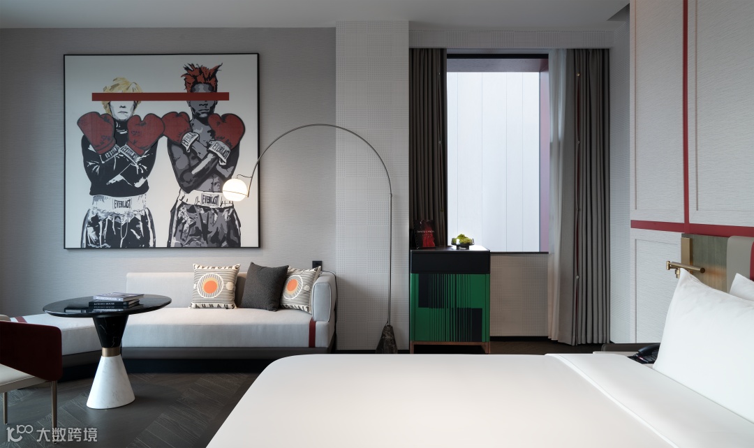 红调套房融合了古代拳法与现代拳击的力量与决心,色调热烈,设计豪华。套房会客厅设置较强娱乐属性的空间,将拳套场馆比赛牌信息灯元素植入其中,营造出拳击红人馆的娱乐氛围。客房则选择相对静态的手法,红线装饰线勾勒出背景,复古的落地电视机柜子,艺术家合影的波普艺术主题画。红调套房的将拳法的刚劲与欢笑的轻松结合,体现出力量中的欢愉,营造出既强大又愉快的氛围。