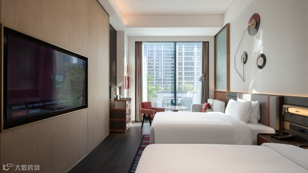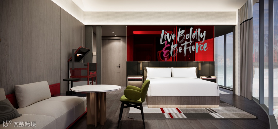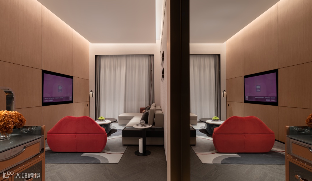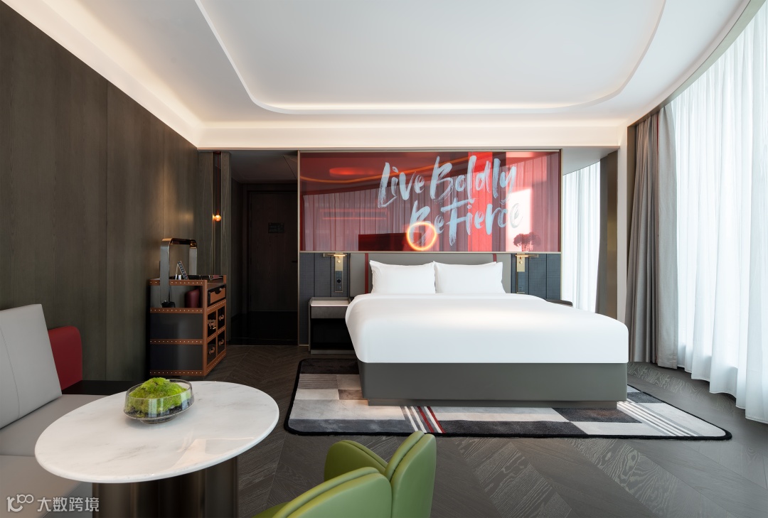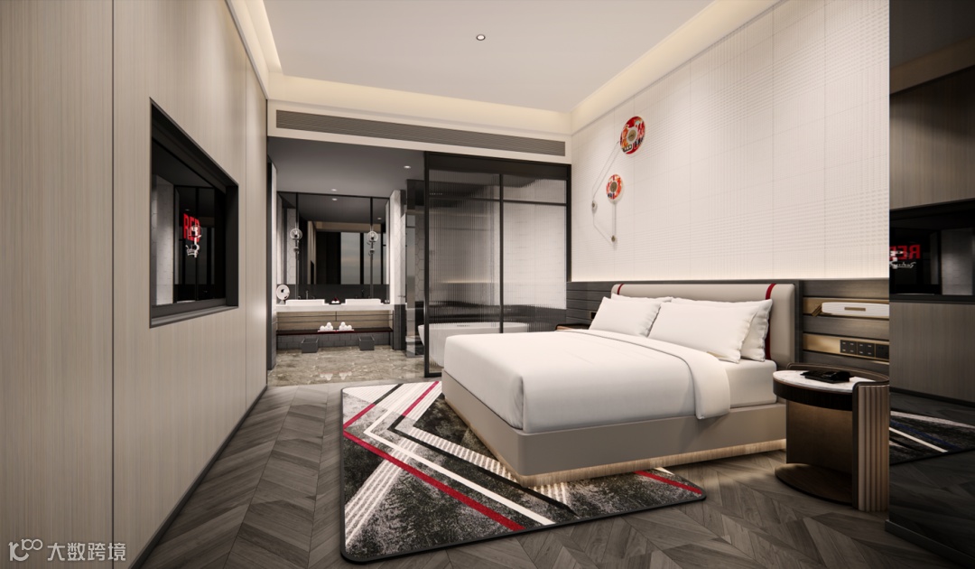 红调套房融合了古代拳法与现代拳击的力量与决心,色调热烈,设计豪华。套房会客厅设置较强娱乐属性的空间,将拳套场馆比赛牌信息灯元素植入其中,营造出拳击红人馆的娱乐氛围。客房则选择相对静态的手法,红线装饰线勾勒出背景,复古的落地电视机柜子,艺术家合影的波普艺术主题画。红调套房的将拳法的刚劲与欢笑的轻松结合,体现出力量中的欢愉,营造出既强大又愉快的氛围。