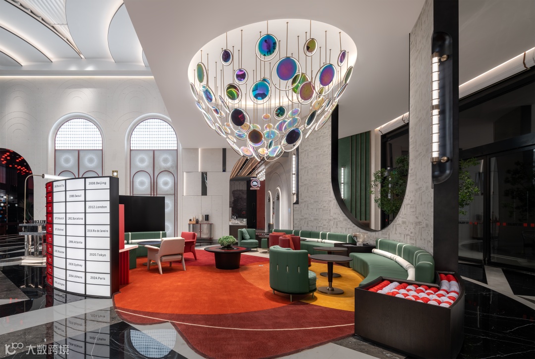 大堂设计灵感源自古代运动会的主场馆,结合现代奥林匹克体育场的元素,营造出恢弘大气的氛围。设计采用放射形布局,中央设有象征“点燃运动之火”的装置,寓意传承千年的体育精神。大堂前台背景墙的时间模块对应历届奥运主办地及时间,象征时间的流动与体育精神的永恒。背景墙后部休息区吊饰设计如上升的气球,共庆开幕的欢乐。体现众多运动员齐聚一堂,共同追求卓越的精神,象征着团结、力量和全球共同参与的氛围。
