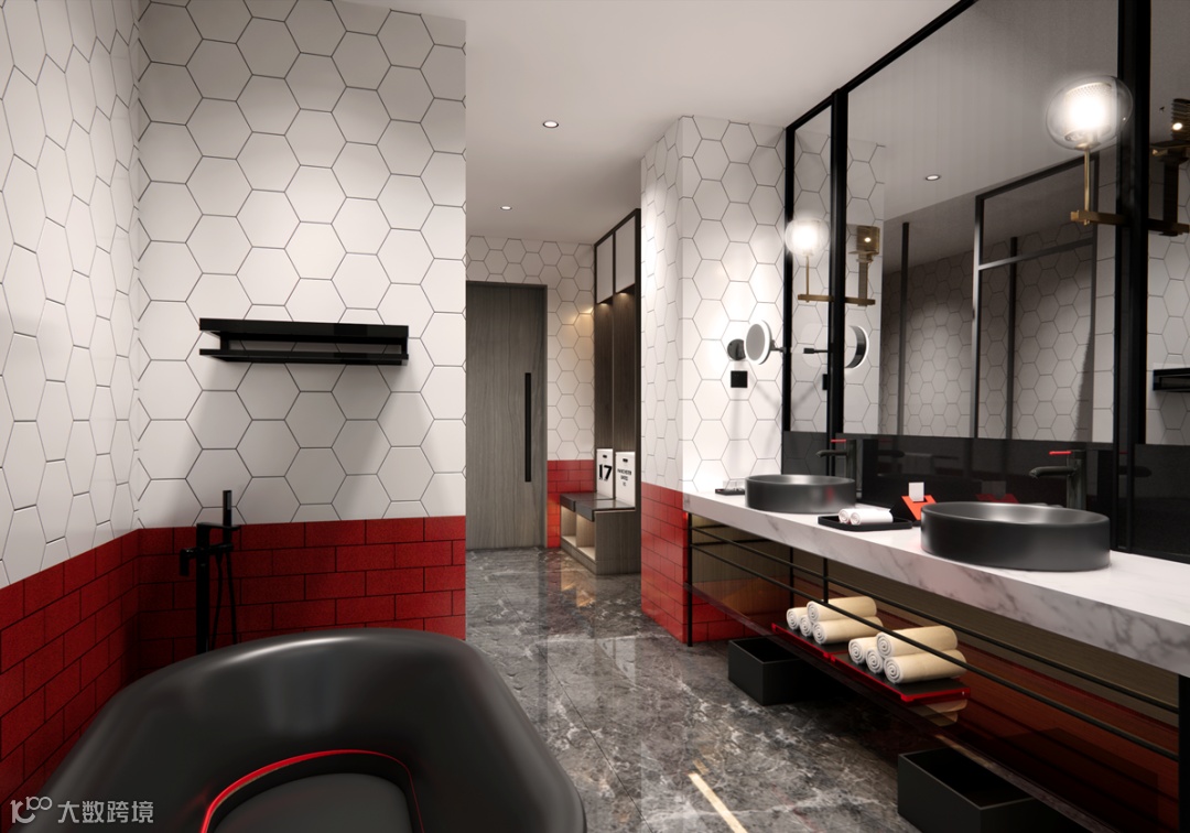臻选套房设计灵感源于太极的阴阳平衡与现代足球的动态对抗,动静规划有秩序,色调对比强烈。寓意太极中的和谐与足球的竞技。背景墙以户外红砖及球网入球的动态感构成客厅主要元素,色调对比强烈。卫生间等位置与足球六边形原始契合,黑红额碰撞更显足球运动中的热血,强烈。