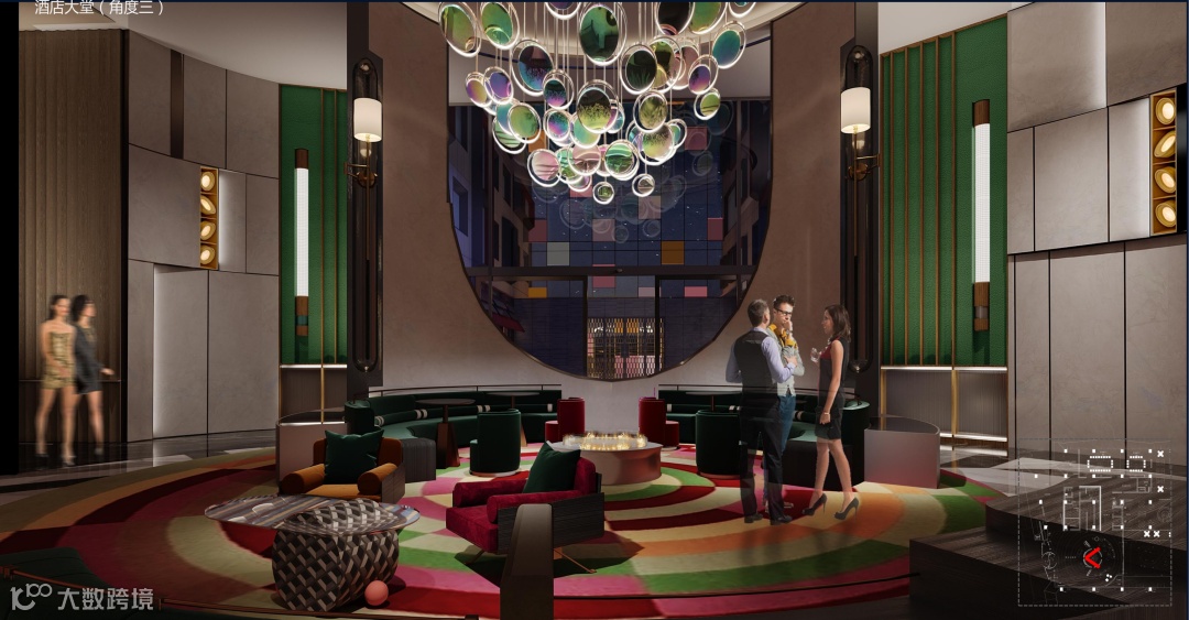 互动区以大面不锈钢形式做饰面,点状互动灯与DIGI WALL相互形成一个游乐大型互动空间,集合了丽芮独有的互动装置,打造独有无二的酒店互动空间。