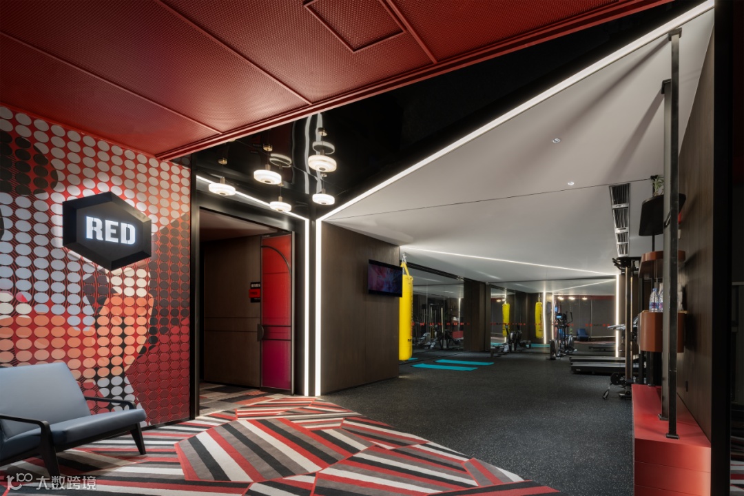 举鼎与举重的力量之源-鼎力相助。健身房以举重为主题,主题来源于古代运动项目举鼎,打造活力、有力量的运动空间。在健身房营造更高品质氛围体验的同时,为运动带来更多乐趣。古代举鼎与现代举重的都是力量的传承。设计通过几何造型与材质对比,突出力量感。墙面装饰古代妆容女子举铁的图案,空间风格与灯光的融合,象征力量与平衡的美感。
